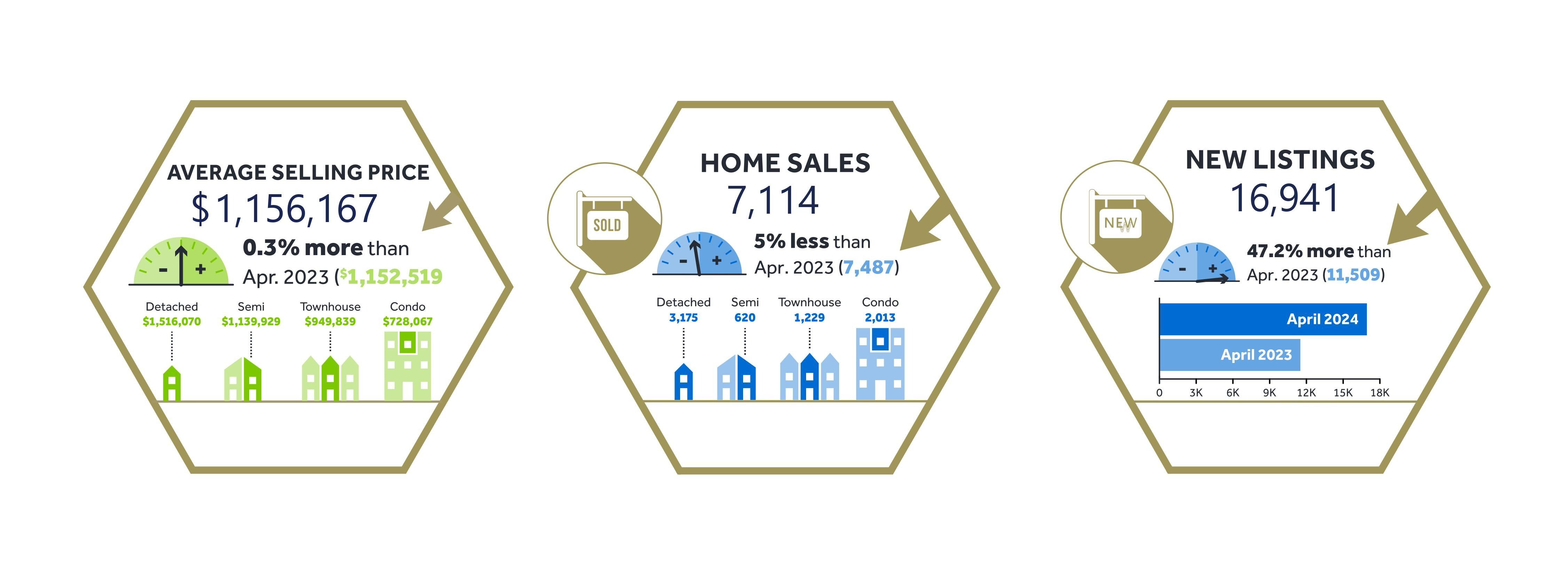 Here's the breakdown: While home sales experienced a slight downturn compared to last April, new listings surged remarkably, offering prospective buyers an expanded array of options without significant fluctuations in average prices.